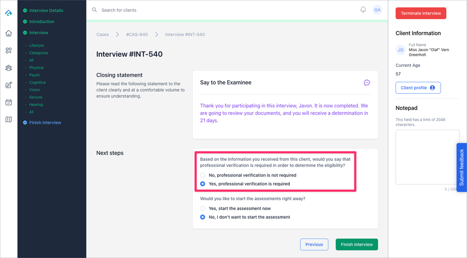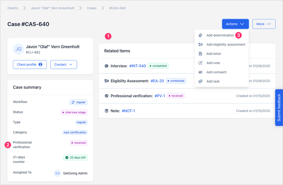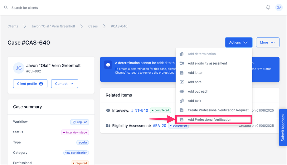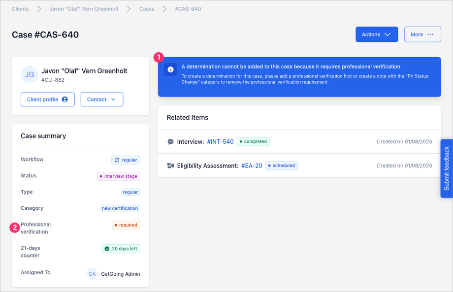 Professional Verification (PV) helps validate whether a client's stated condition qualify them for ADA Paratransit Services. In GetGoing Cloud, the PV process is designed to maintain integrity by preventing determinations or case completion until either a PV is properly processed or explicitly marked as not required.